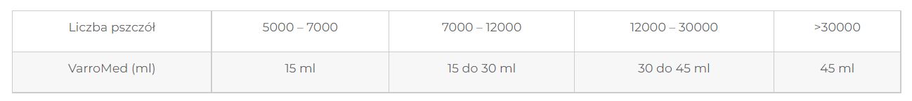 Pred použitím pretrepte. Dávku je potrebné starostlivo prispôsobiť veľkosti včelstva (pozri dávkovaciu tabuľku). Určite veľkosť včelstva a počet priestorov obsadených včelami, ktoré sa majú ošetriť, a potom vyberte potrebné množstvo prípravku. Použite nasledujúcu schému dávkovania podľa tabuľky: