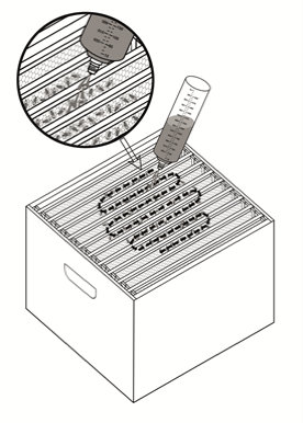 podávanie v úli. Prípravok aplikujte včelám do medzirámových pásov hniezdneho telesa . Zabezpečte, aby ošetrené včely mali dostatočný prístup k pitnej vode.