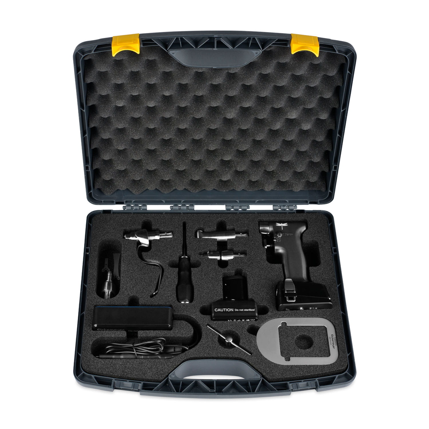 Krytky s rôznym použitím: Systém obsahuje nástavce, ako napríklad AO (na skrutkovanie), rýchloupínacie skľučovadlo na drôt / klince KIRSCHNER / STEINMANN, vŕtacie skľučovadlo Jacobs a oscilačná píla na presné rezy.