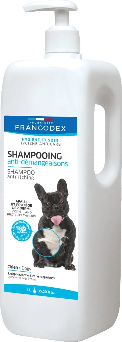 Tu je popis produktu: antipruritický šampón pre psov 1 l Francodex. Svrbenie kože u vášho psa môže výrazne znížiť úroveň jeho pohodlia. Náš šampón proti svrbeniu poskytuje vášmu psovi okamžitú úľavu vďaka výťažku zo sladkého drievka, ktorý účinne zmierňuje pocit svrbenia. Neutrálne pH nedráždi pokožku, zachováva jej prirodzenú úroveň vlhkosti a výťažok zo zimolezu zabraňuje strate vody.