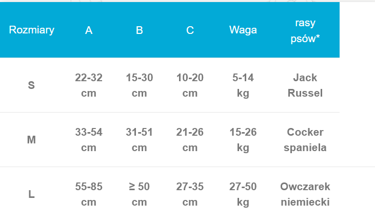 Po zmeraní bodov A, B a C a určení hmotnosti vášho psa sa riaďte veľkostnou tabuľkou.