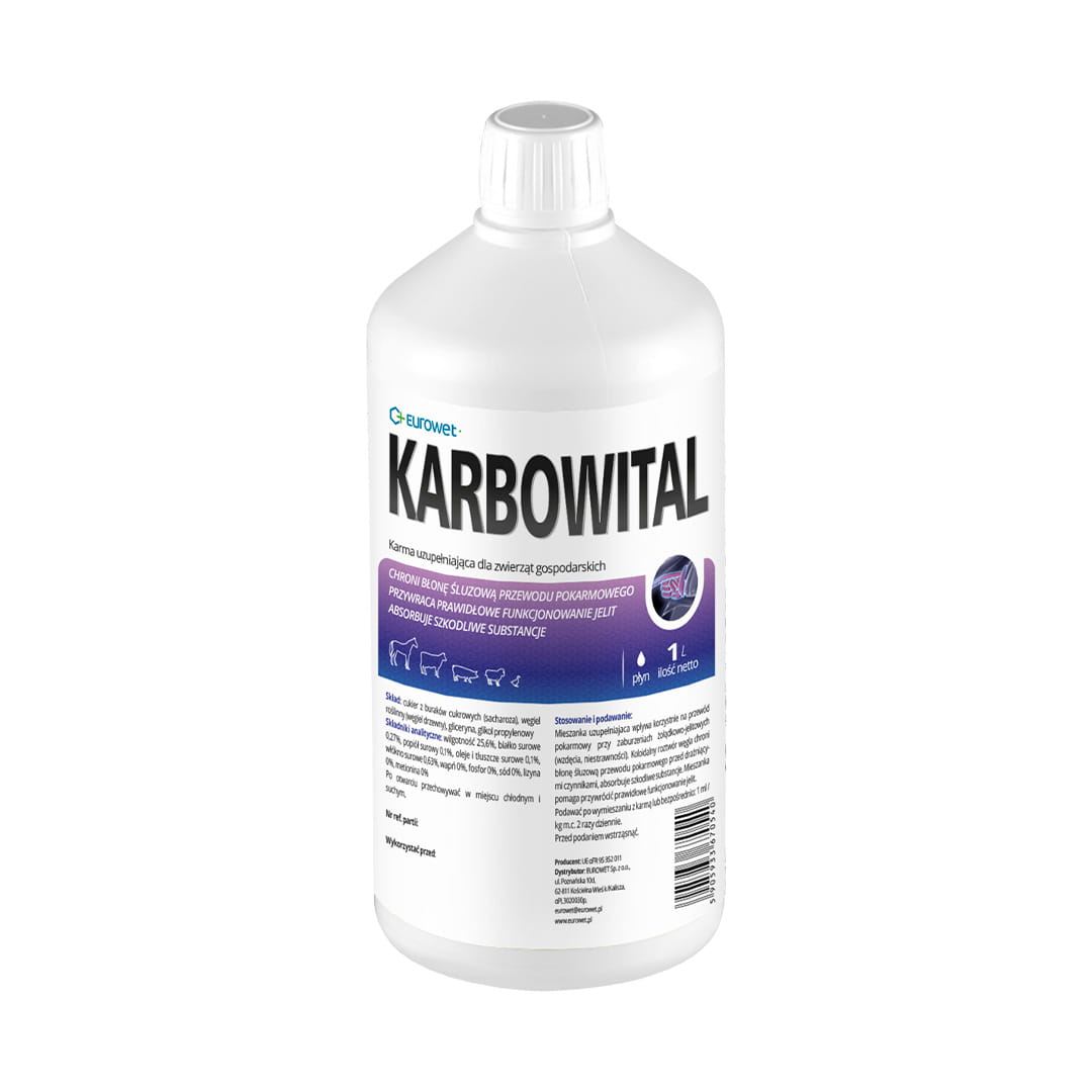 Charakteristika a použitie: Carbowital je tekuté doplnkové krmivo špeciálne vyvinuté pre hospodárske zvieratá na pomoc pri gastrointestinálnych poruchách, ako je plynatosť alebo tráviace ťažkosti. Vďaka roztoku koloidného uhlíka dokáže tento prípravok chrániť sliznicu tráviaceho traktu pred dráždivými látkami a absorbuje škodlivé látky, ktoré môžu vznikať počas tráviacich procesov. Carbowital podporuje a udržiava správne fungovanie čriev zvieraťa.