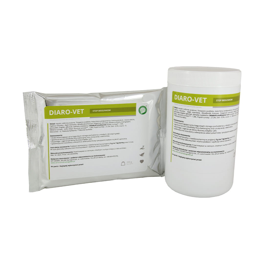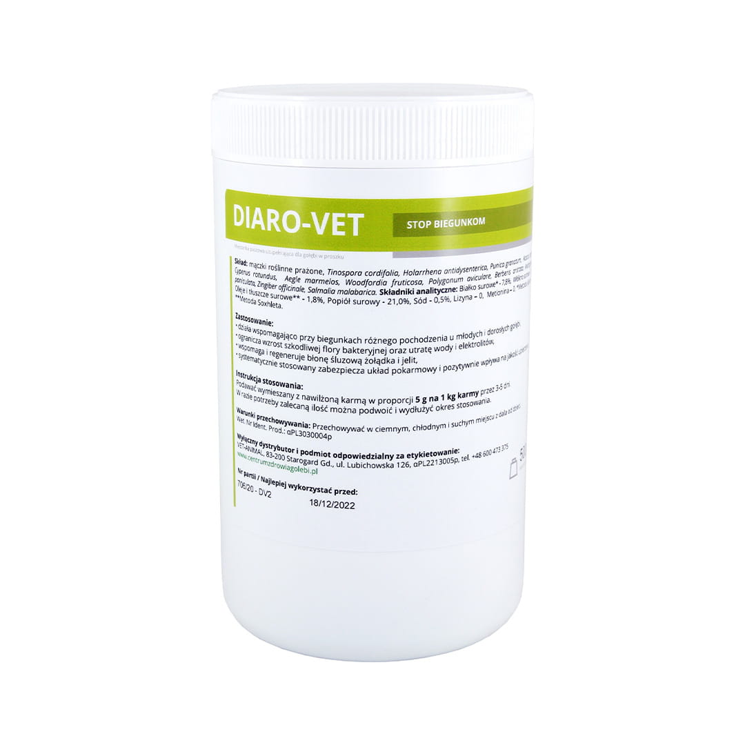 DIARO-VET je výrobok špeciálne navrhnutý na podporu a zmiernenie hnačky rôzneho pôvodu u mladých a dospelých holubov. Hnačka môže byť pre vaše vtáky vážnym problémom, preto je DIARO-VET ideálnym riešením, ktoré pomáha znižovať rast škodlivej bakteriálnej flóry, straty vody a elektrolytov a regenerovať žalúdočnú a črevnú sliznicu.