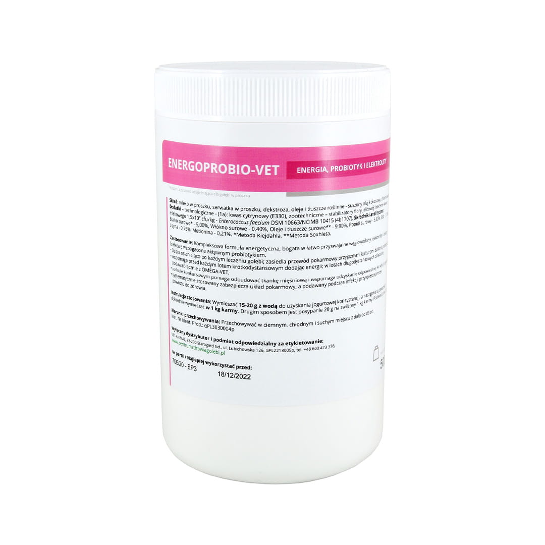 EnergoProbio-Vet obsahuje dextrózu, sušenú srvátku, mliečne izoláty, chlorid sodný, rastlinné oleje a tuky a probiotické baktérie mliečneho kvasenia - Enterococcus faecium. Táto jedinečná kombinácia zložiek poskytuje energiu, ochranu a podporu pre vaše holuby v každej situácii. EnergoProbio-Vet je kľúčom k udržaniu zdravia a kondície vašich vtákov.