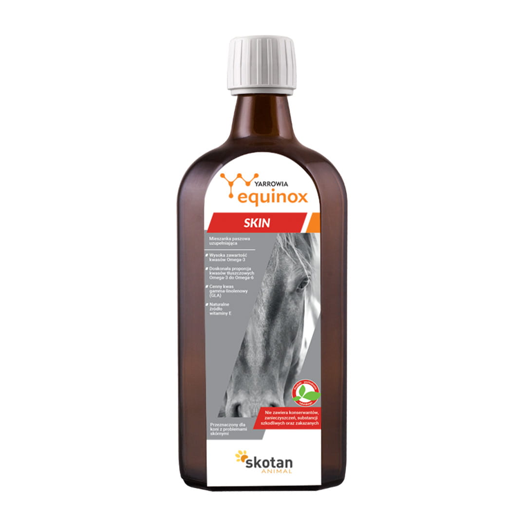 Equinox Skin je špeciálna doplnková kŕmna zmes vytvorená spoločnosťou YARROWIA, ktorá pomáha starať sa o kožu a srsť vášho koňa. Tento produkt bol vyvinutý s ohľadom na zdravie koní a poskytuje cenné živiny a omega-3, 6 a 9 mastné kyseliny vo forme bioesterov.