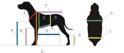 Vzdialenosť od prednej labky v podpazuší po: u psov po penis, u sučiek po pazuchu zadnej labky