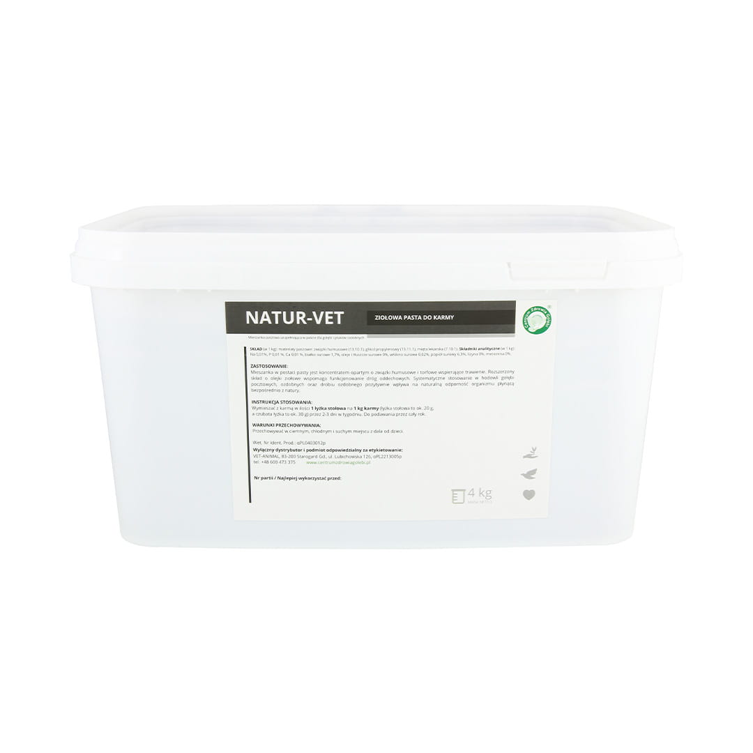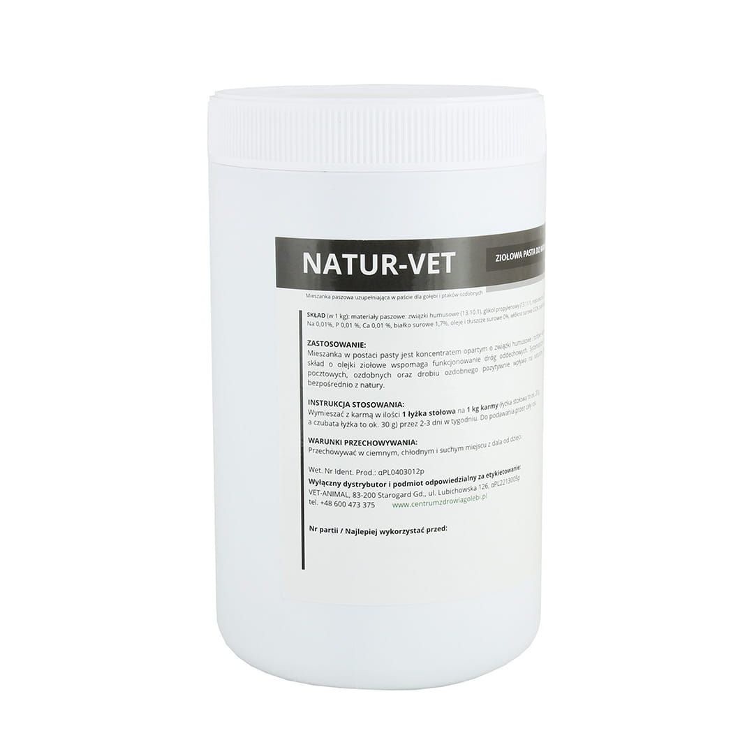 NATUR-VET je jedinečný produkt vo forme pasty, vytvorený s ohľadom na zdravie vašich holubov a okrasnej hydiny. Táto pasta obsahuje prírodný koncentrát na báze humínových, fulvo- a rašelinových zlúčenín, ktorý je bohatý na triesloviny a minerály podporujúce trávenie a celkovú kondíciu vtákov. Okrem toho bola pasta obohatená o rastlinné oleje na podporu dýchacích funkcií.