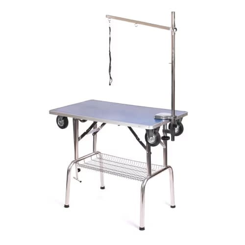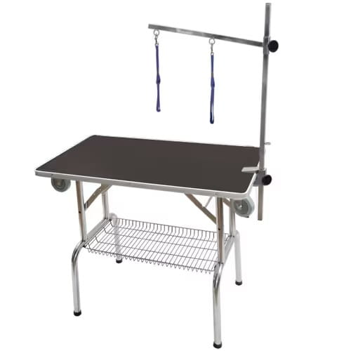 Predstavujeme pohodlný strihací stôl Blovi, ideálny pre mobilných ošetrovateľov a chovateľov. Tento všestranný stôl s kolieskami a jednostranným výsuvným ramenom sa dodáva s praktickým košom na príslušenstvo a šnúrkou v balení. Ideálny na použitie na výstavách, na česanie, trimovanie alebo aj ako nosič na prepravu klietok alebo iného príslušenstva.