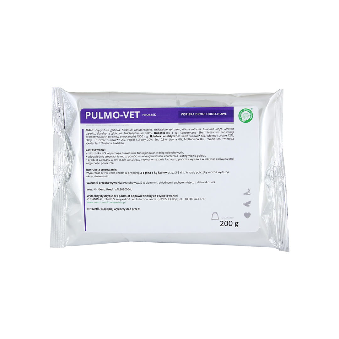 PULMO-VET PROSPECT je inovatívna zmes bylín vytvorená na podporu zdravia dýchacích ciest u holubov. Výrobok obsahuje starostlivo vybraný súbor prírodných zložiek, ako je sladké drievko, cesnak, rasca, kurkuma, zázvor a eukalyptus, vo vhodnom pomere, ktoré ovplyvňujú správne fungovanie dýchacieho systému a posilňujú jeho imunitu. Prečo používať PULMO-VET PROSZE?