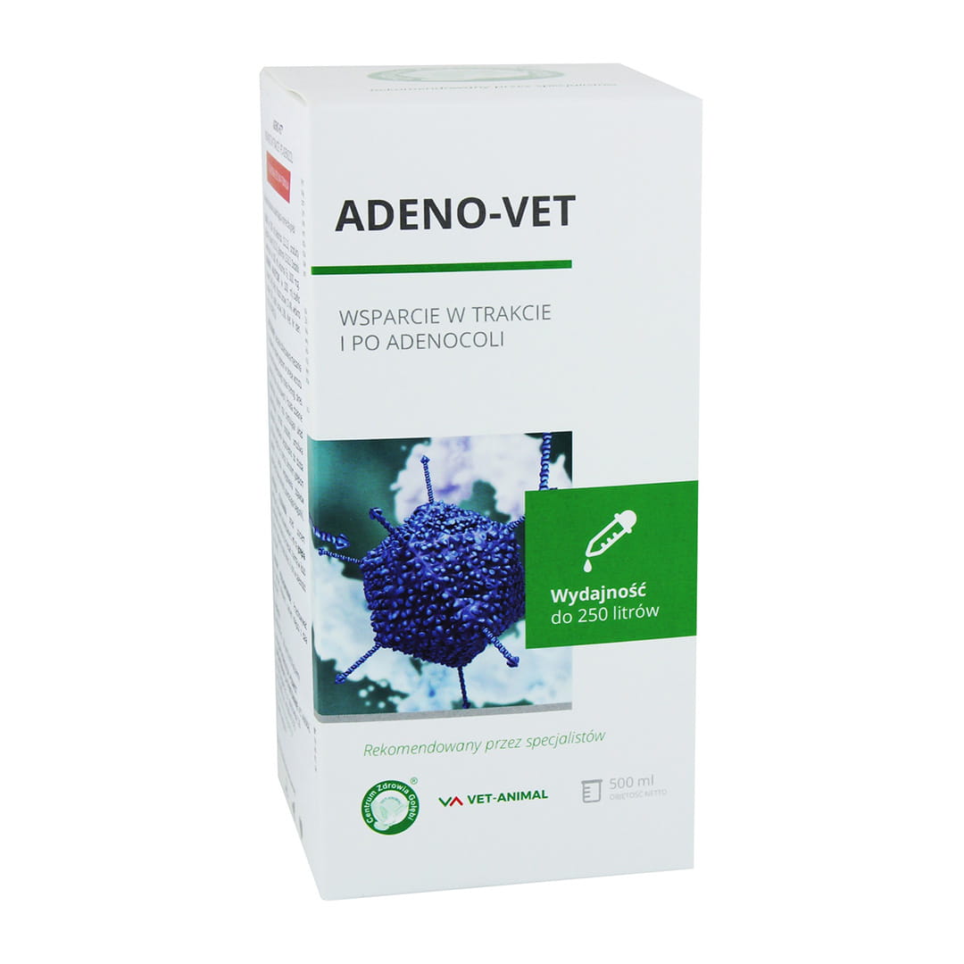 Pred použitím výrobok pretrepte. Mladým holubom podávajte 1 ml prípravku ADENO-VET na holuba priamo do zobáka alebo ho zmiešajte s krmivom v množstve 10 ml na kg krmiva počas 2-5 dní v závislosti od situácie. Pri použití ADENO-VET v krmive sa odporúča podávať aj PROB-VET MAX vo vode.