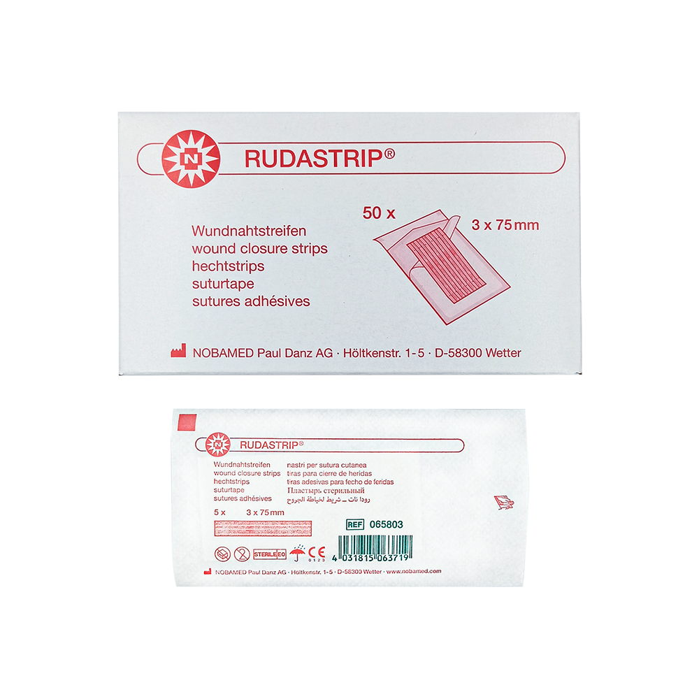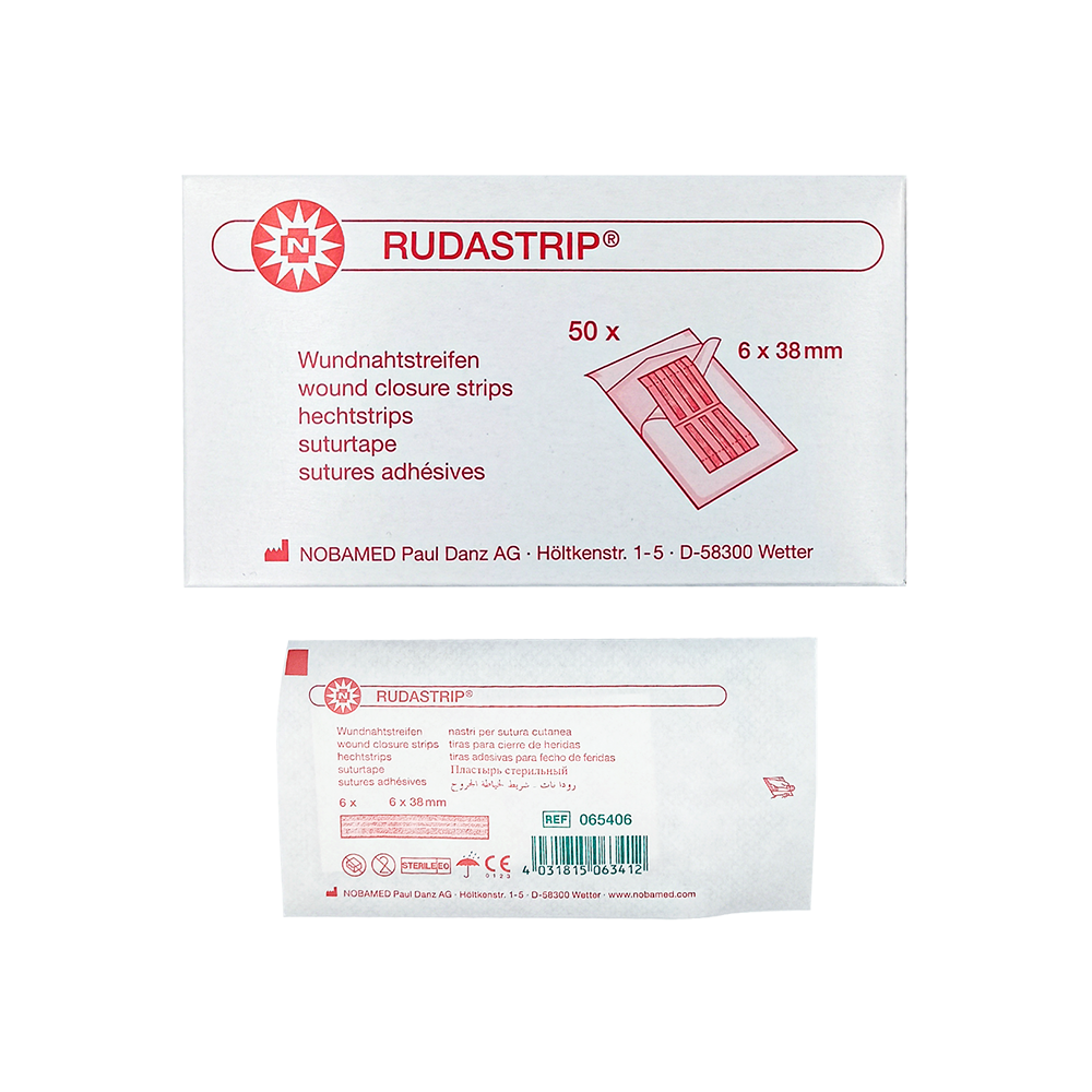 RUDASTRIP prúžky na uzatváranie rán sú samolepiace prúžky, známe ako vonkajšie stehy. Používajú sa na bezbolestné uzatváranie malých rezných rán a drobných chirurgických rán. Výrobok je vyrobený z odolnej nylonovej netkanej textílie. Sú tenké a pružné, tvarovo sa prispôsobia rane, nebránia pohybu a umožňujú pokožke dýchať. Na použitie ako samostatný obväz alebo v kombinácii s chirurgickými stehmi alebo sponkami.