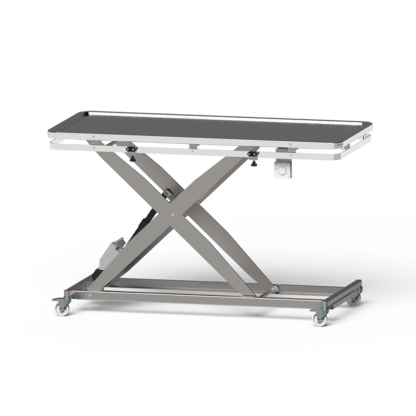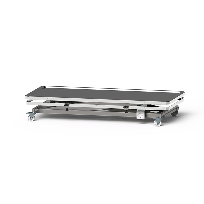 8. Mobilita a nosnosť: Stôl je osadený na stabilnom nožnicovom ráme, ktorý zabezpečuje stabilitu. Základňa je mobilná, čo uľahčuje premiestňovanie stola po zdravotníckom zariadení. Stôl dostal pôsobivú nosnosť 150 kg, čo umožňuje vykonávať rôzne lekárske zákroky.