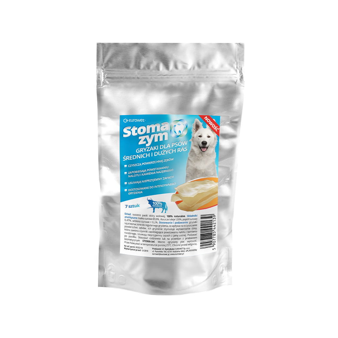 Stoma Zym je úplne prírodné hryzadlo pre malé, stredné a veľké plemená psov, určené na pravidelné žuvanie na čistenie zubov. Pri žuvaní Stoma Zym stimuluje slinné žľazy vášho psa k produkcii väčšieho množstva slín, ktoré obsahujú faktory pozitívne ovplyvňujúce zdravie zubov. Zabraňujú tvorbe zubného kameňa a odstraňujú nepríjemný zápach z tlamy. Na dosiahnutie najlepších výsledkov používajte výrobok denne po jedle. Silne odhryznutú klapku je potrebné zlikvidovať.