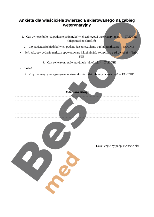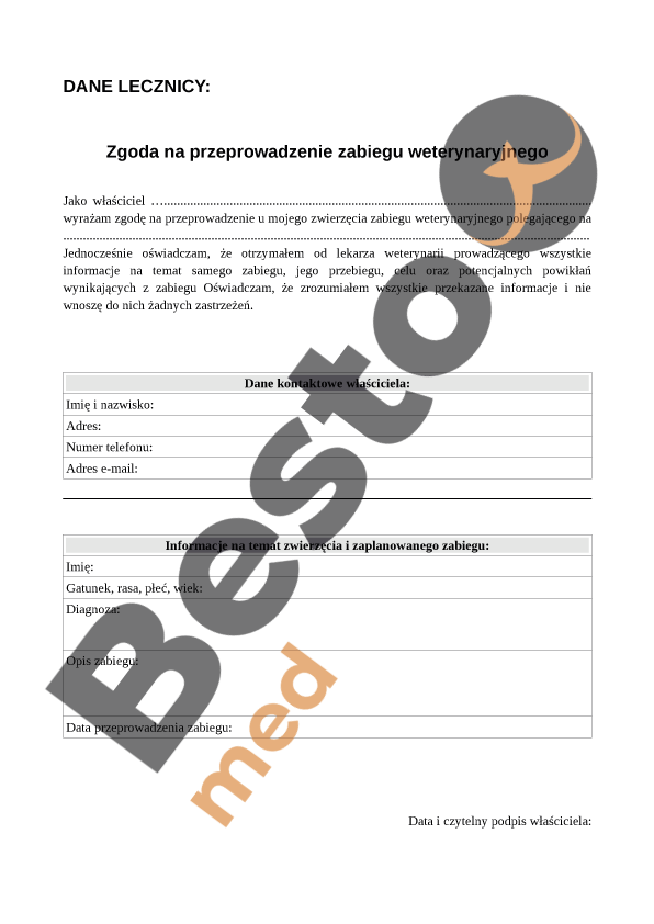 Formulár súhlasu: Vo väčšine prípadov veterinári používajú formálne formuláre súhlasu, ktoré dokumentujú informácie o majiteľovi, opis postupu, dátum, podpis majiteľa a podpis veterinára.