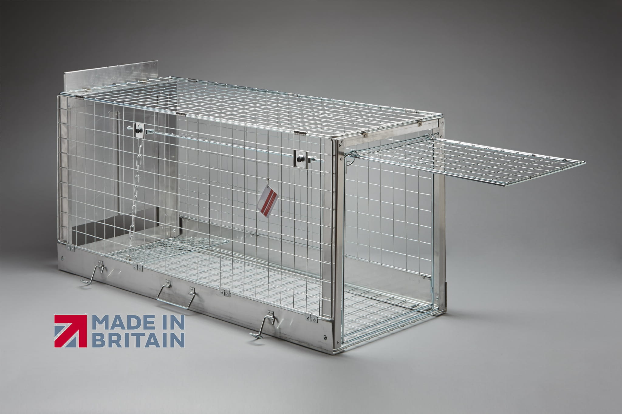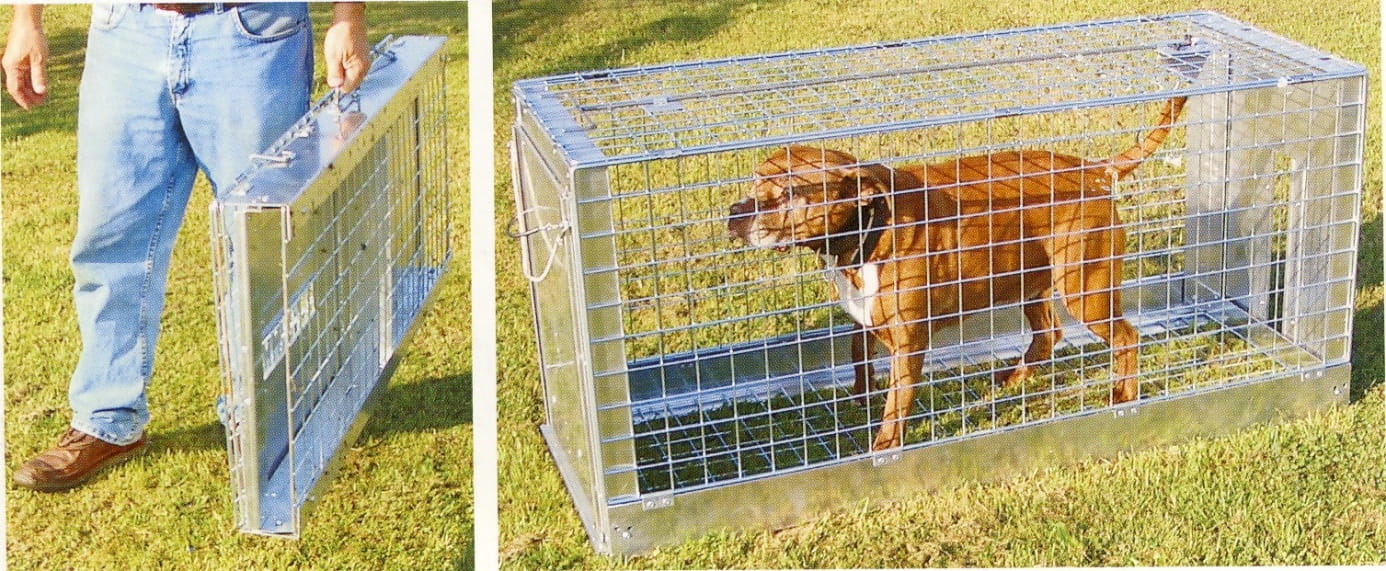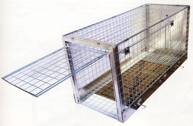 Veľká skladacia klietka z odolného pozinkovaného pletiva z nehrdzavejúcej ocele. Ľahko sa skladá, prenáša, prepravuje, skladuje a dezinfikuje. Navrhnutá po konzultácii s odborníkmi z odvetvia na humánny odchyt zvierat. Má odolný a samočinný spúšťací mechanizmus umiestnený vo vnútri klietky. Hneď ako sa na ňu zviera postaví a siahne po návnade, spúšťacie dvierka sa automaticky spustia a zablokujú a zabránia zvieraťu opustiť klietku. Podlhovastý otvor v druhých dvierkach umožňuje umiestnenie chápadla do klietky a presun chyteného zvieraťa von z klietky. Veľkosť oka 5 x 5 cm. Najpredávanejšia klietka na humánny odchyt veľkých zvierat. Po zložení klietka meria: d.131 x š.54 x v.12 (cm)