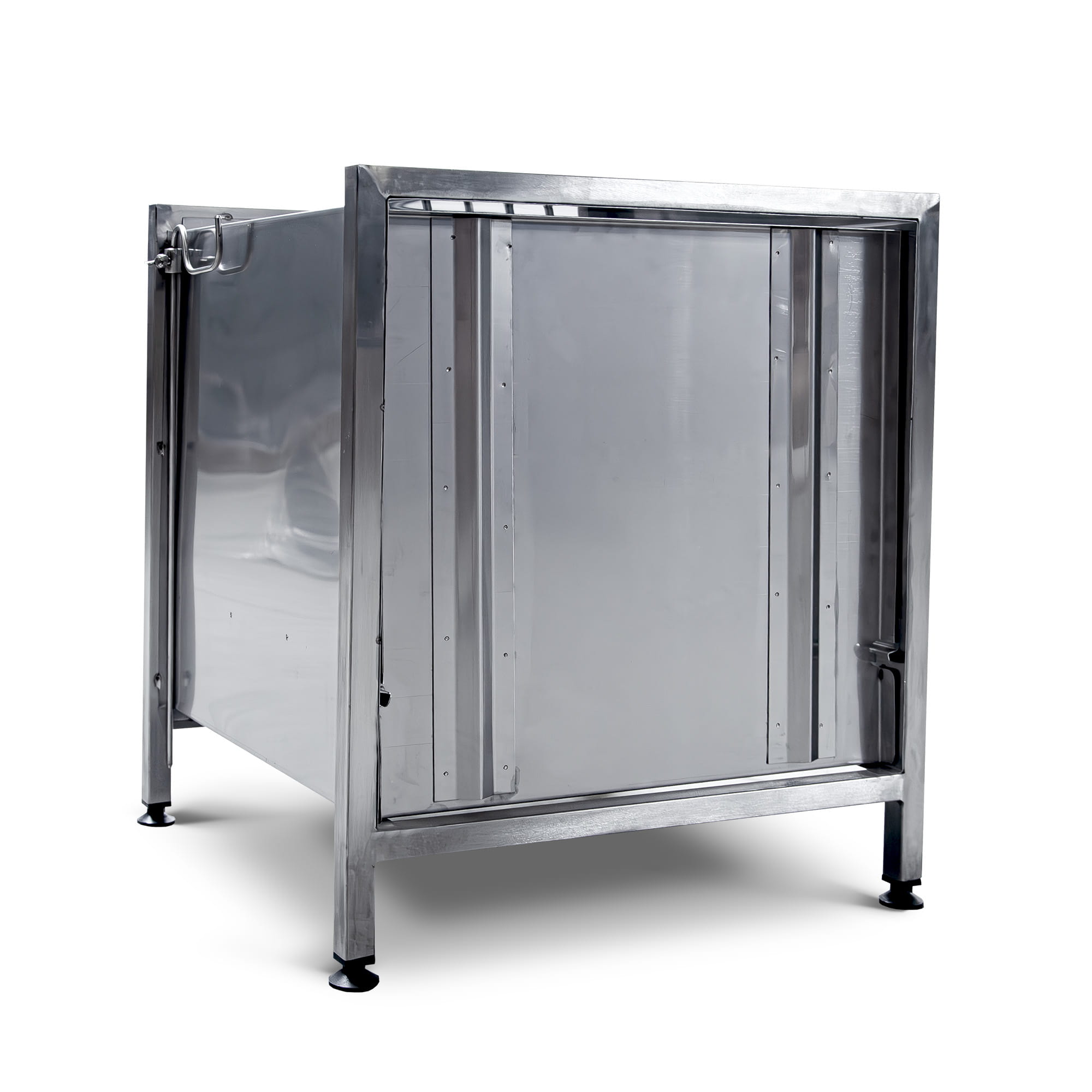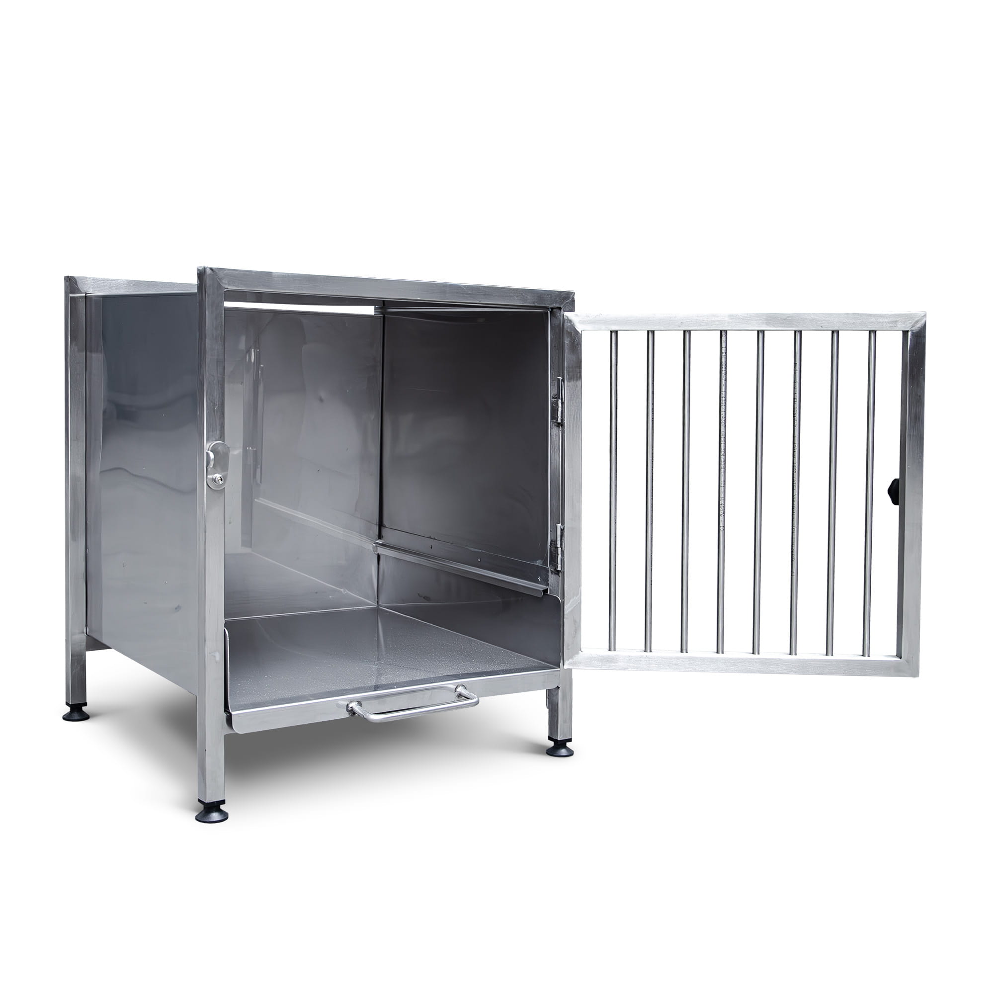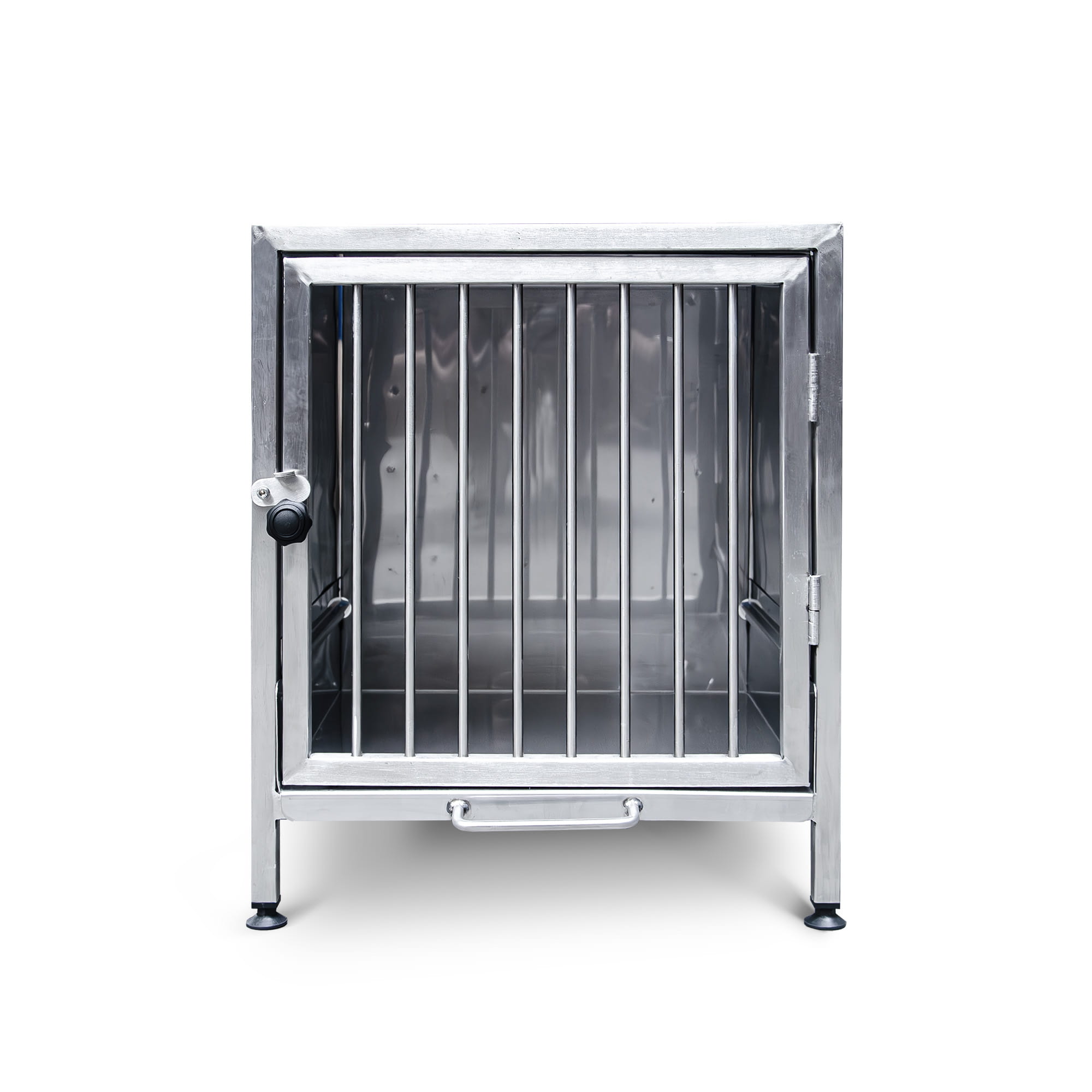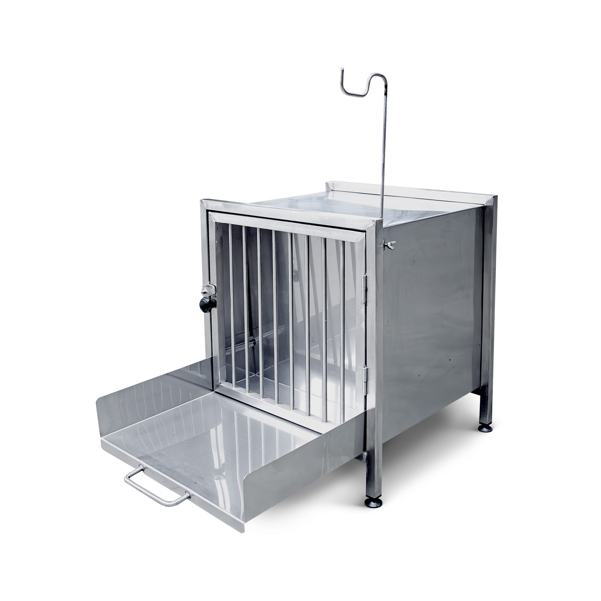 Klietka je celá vyrobená z nehrdzavejúcej ocele, ktorá zaručuje odolnosť a uľahčuje jej údržbu. Je vybavená zásuvkou na stabilizáciu pacienta, ktorá uľahčuje podávanie injekcie. Táto funkcia zvyšuje bezpečnosť a pohodlie lekárskeho tímu. Na bočnom paneli sa nachádza držiak na voliteľný infúzny stojan, ktorého výšku možno nastaviť pomocou motýlikového gombíka.