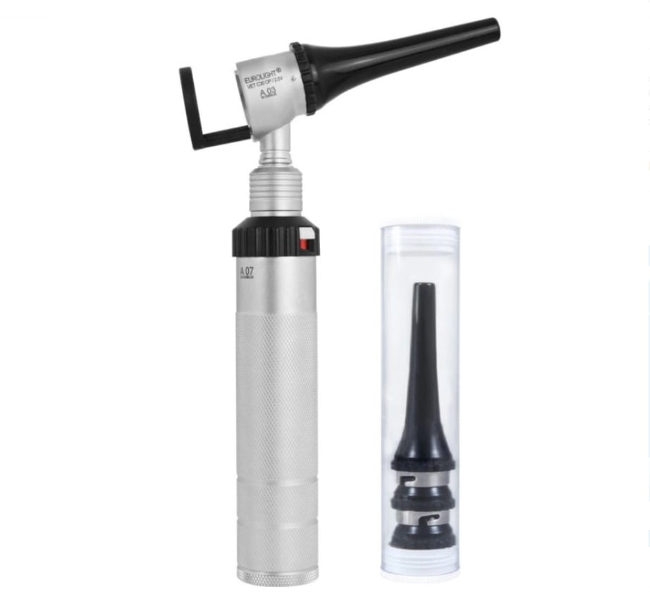 Veterinárny otoskop od nemeckej spoločnosti KaWe, EUROLIGHT VET C30 | 2,5 V s otvorenou hlavou - horný zárez hlavy umožňuje ľahkú prácu s nástrojom vo vnútri ucha pacienta.