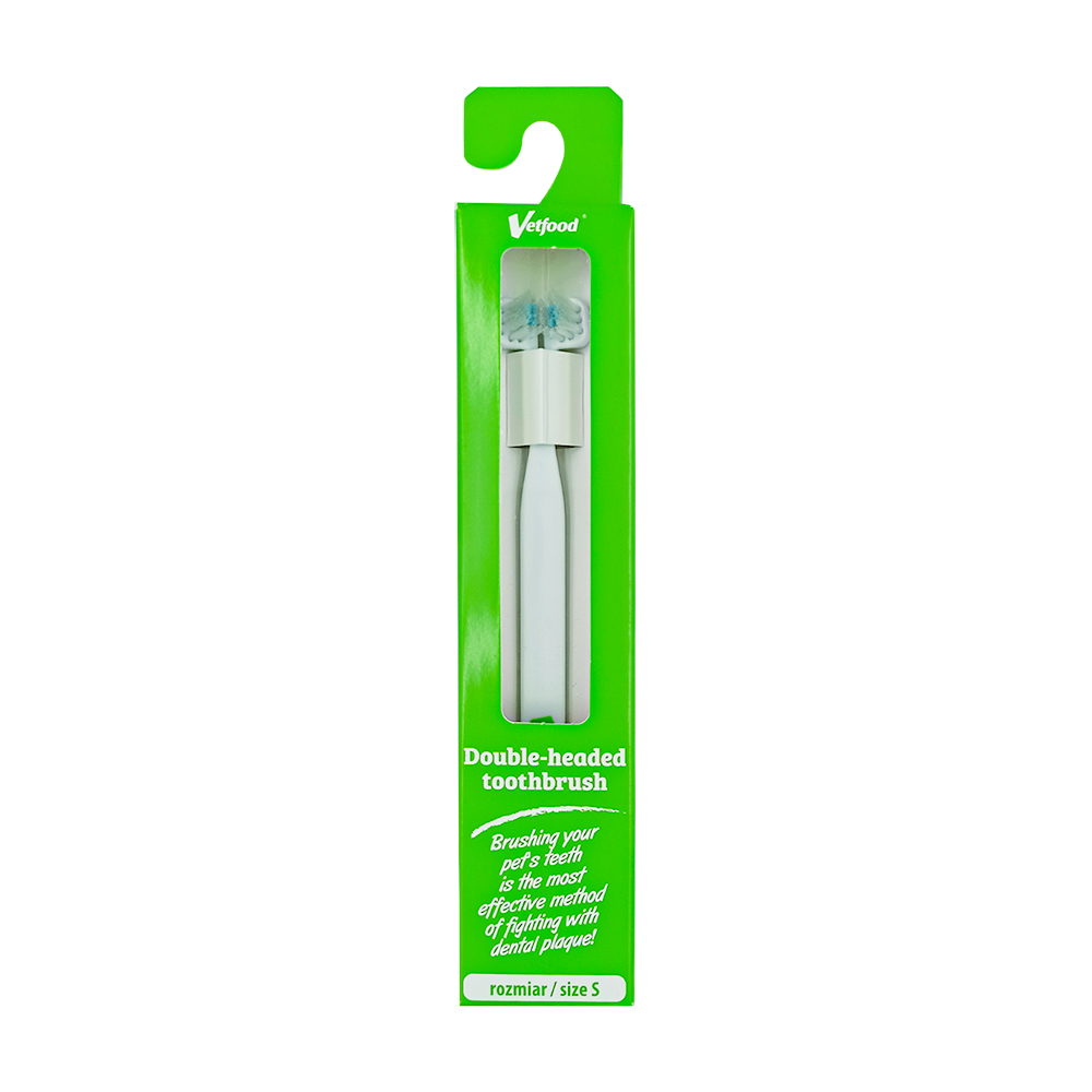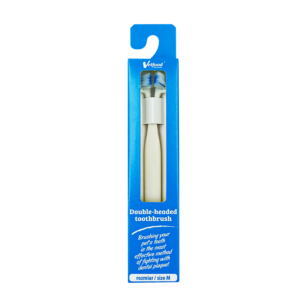 Už na prvý pohľad vidíte, že jej dizajn bol prispôsobený potrebám domácich zvierat. Vetfood Professional má dvojitú hlavicu. Vďaka tomu sú vlákna kefky dokonale prispôsobené anatomickému tvaru zubov vášho domáceho maznáčika. To zase zabezpečuje, že čistenie je výrazne účinnejšie.