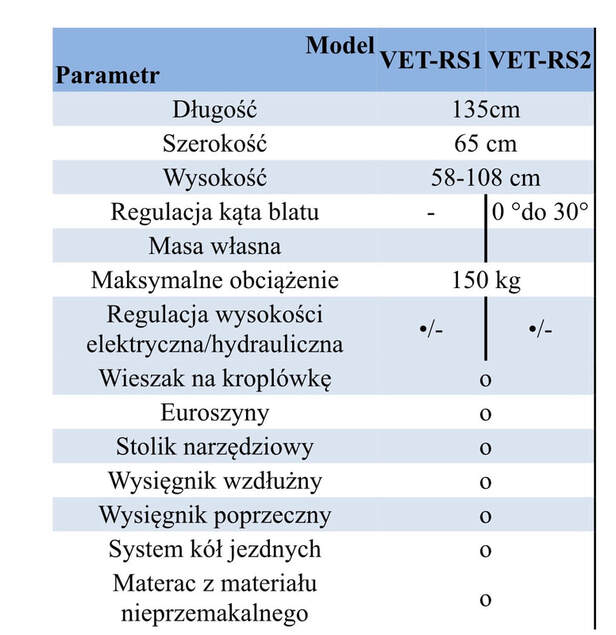 Model veterinárneho ošetrovacieho stola VET RS-1 má stabilnú oceľovú konštrukciu na nastaviteľných nohách, ktorá umožňuje voľný prístup k doske stola. Celá konštrukcia je potiahnutá práškovou farbou, ktorá je odolná voči mechanickému poškodeniu a poškriabaniu. Stôl má pevnú výšku a vrchnú dosku z priehľadného materiálu HPL určenú na röntgenové snímky.